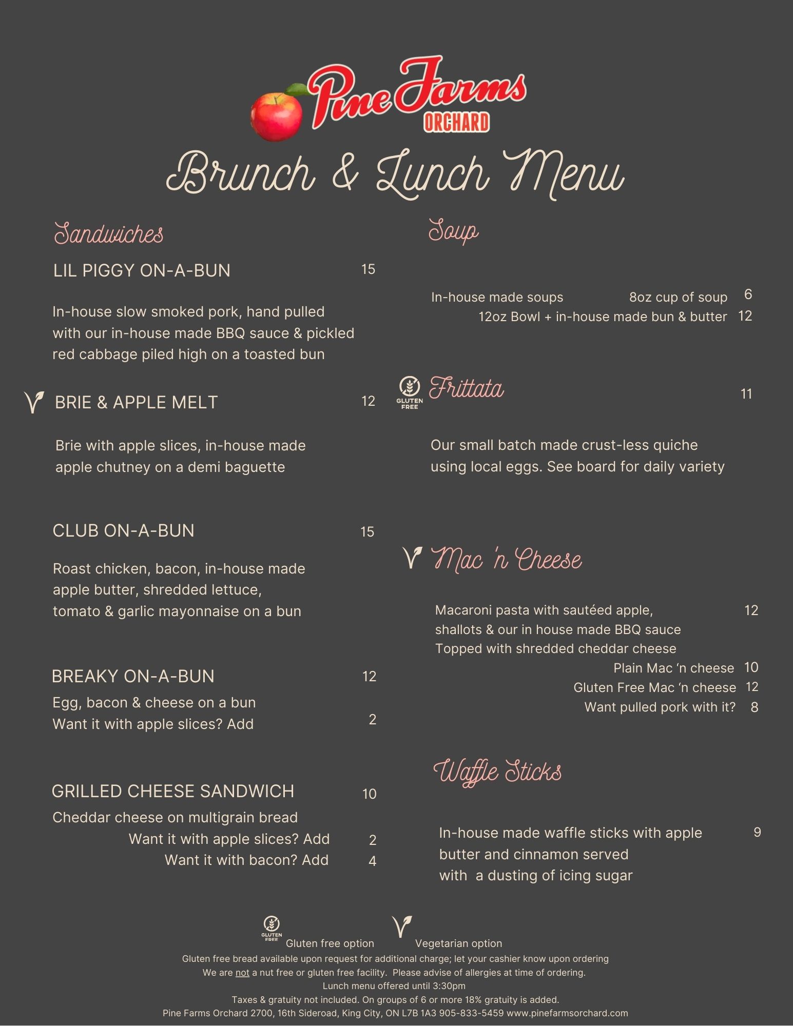 Apples: McIntosh, Cortland, Gala, Honeycrisp, Golden Delicious, Mutsu, Ambrosia, Red Delicious, Russet, Crimson Crisp, Northern Spy.