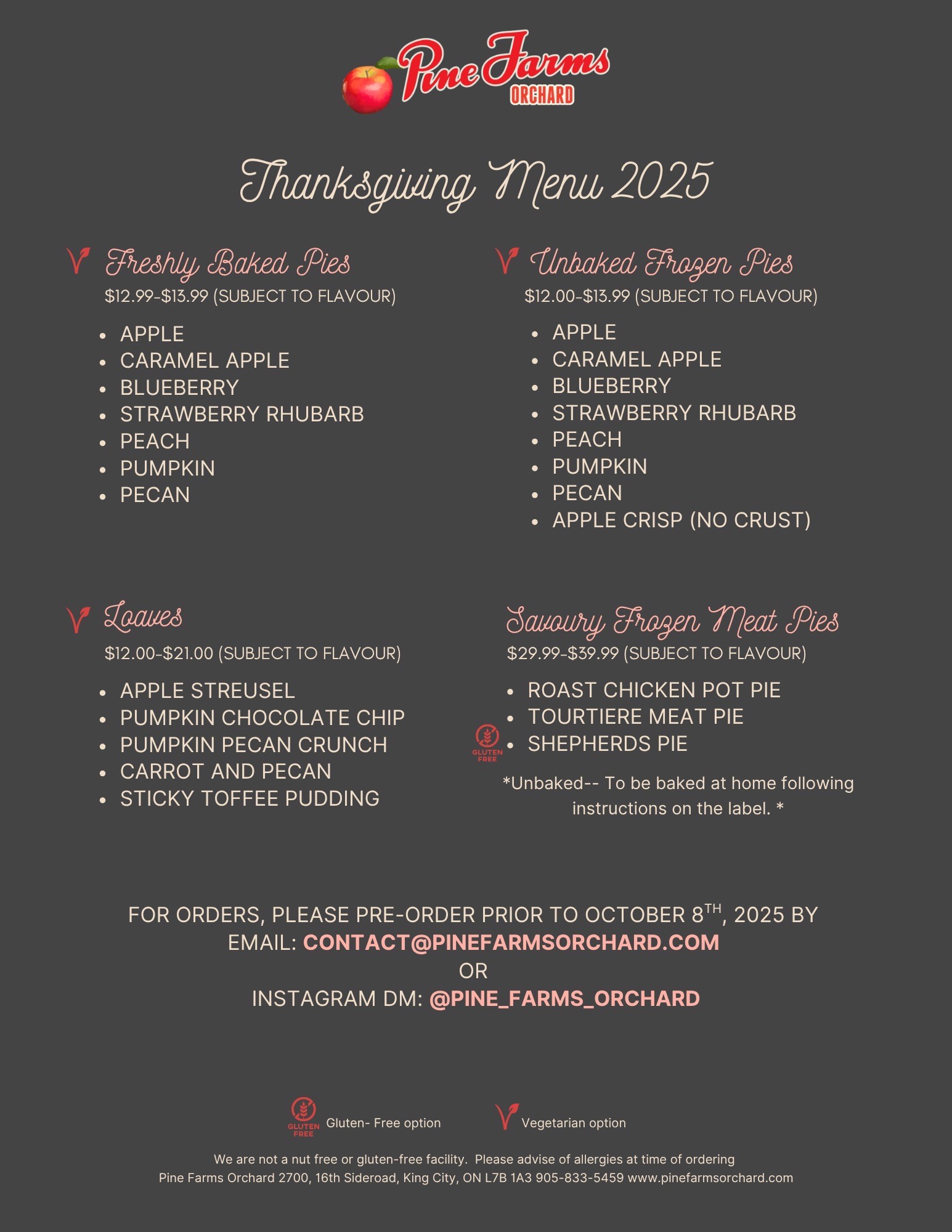Our takeaway windows, outdoor market and orchard are open Tuesday to Sunday. We are open Thanksgiving Monday, closed the Tuesday after then back to regular hours.